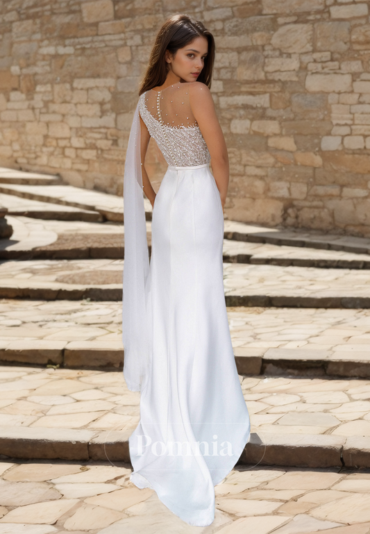 P3098 - A-Line Illusion Neck Beads Pleated Empire Sleeveless Long Beach Wedding Gown