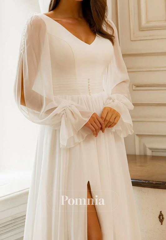 Elegant V-Neck Bishop-Sleeves and Front Slit Chiffon Wedding Dress
