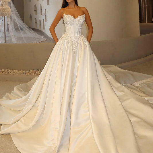Elegant Sleeveless Strapless Sequins Bowknot Satin Wedding Dress