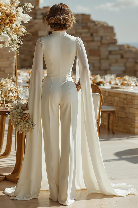 White Long Sleeves Appliqued Bridal Jumpsuits with Cape