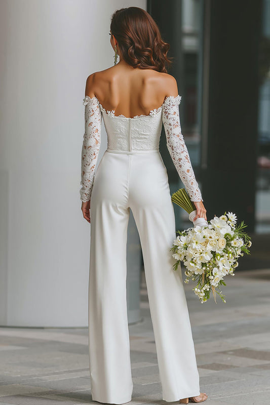 White Off the Shoulder Long Sleeves Bridal Jumpsuits with Lace