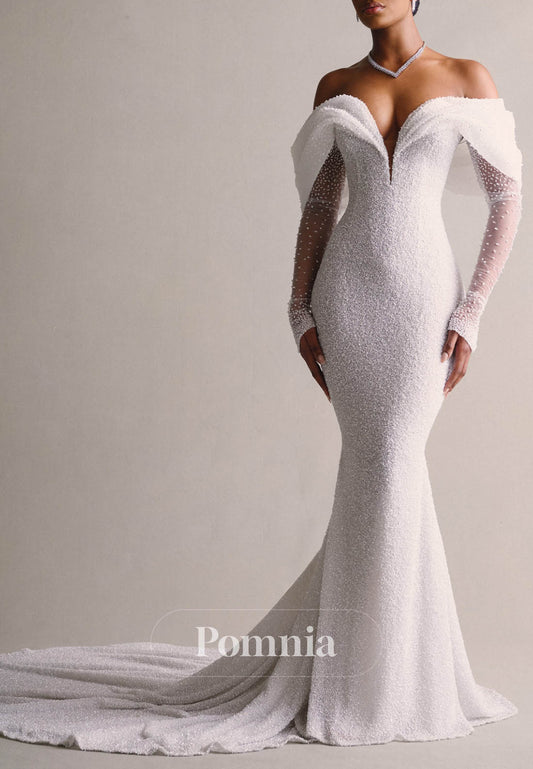 Luxury Off-Shoulder Long Sleeves Detachable Overskirt Mermaid Wedding Dress