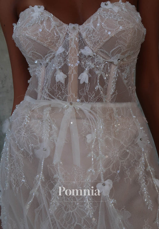 White Strapless Lace Bridal Jumpsuits with Sleeves