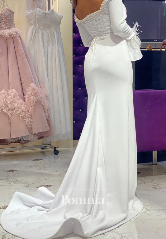 White Long Sleeves Square Feathers Mermaid Wedding Dress