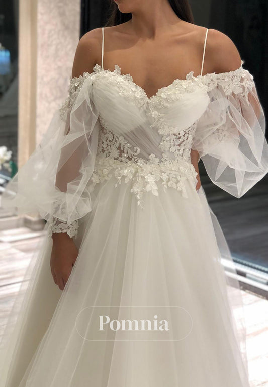 Charming Long Sleeves Off-Shoulder Corset Tulle Appliques Wedding Dress