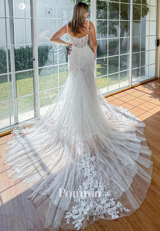 Spaghetti Straps V-Neck Backless Beach Wedding Dress with Train Mermaid Wedding Dress