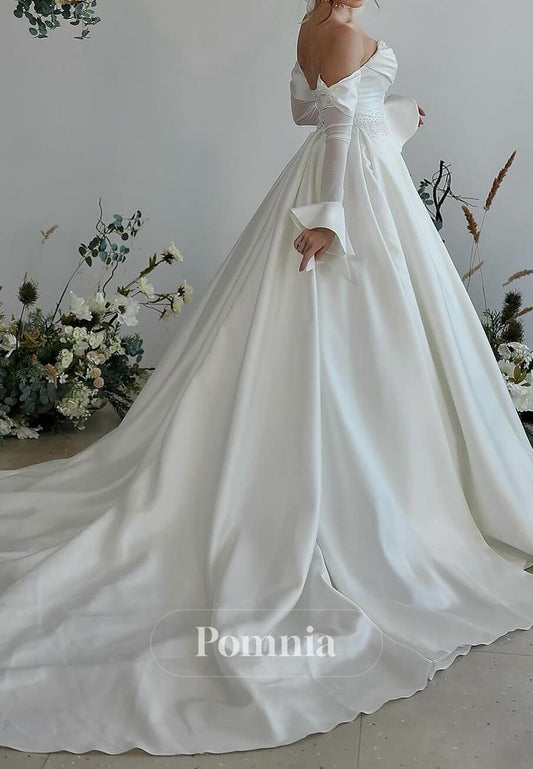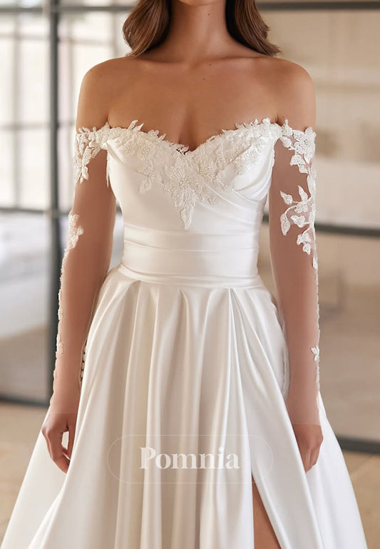 Elegant Long Sleeves Off-Shoulder Slit Satin Wedding Dress