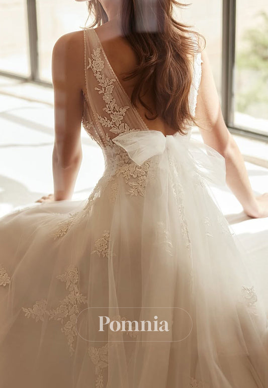 Simple A-Line Spaghetti Straps V-Neck Bowknot Wedding Dress