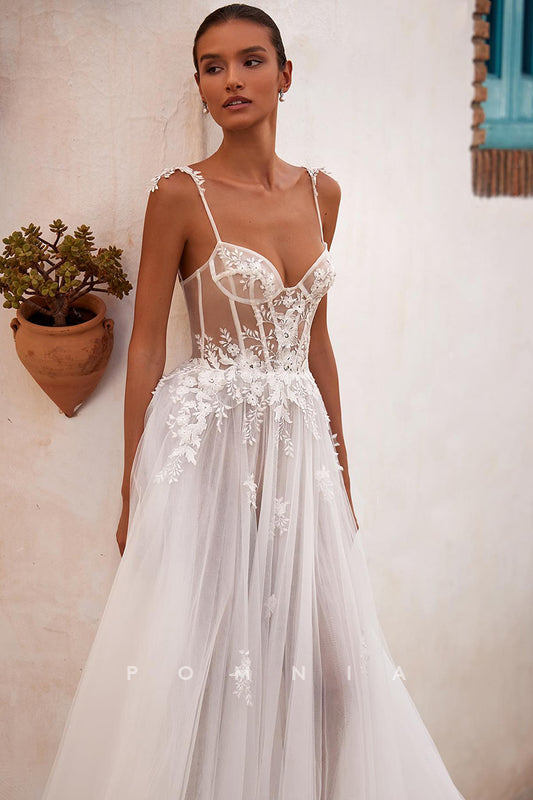 A-Line Spaghetti Straps Scoop Corset Tulle Sweep Train Illusion Long Lace Wedding Dress