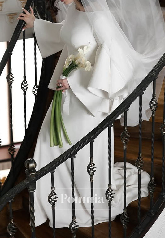 Simple Long Sleevels Scoop Ruched Satin Wedding Dress