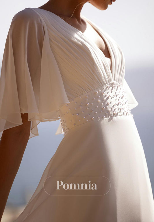 A-Line Short Sleeves V-Neck Backless Pearls Chiffon Wedding Dress