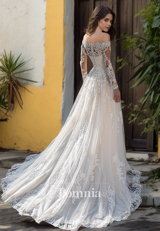 Long Sleeves Off-Shoulder Slit Corset Wedding Dress