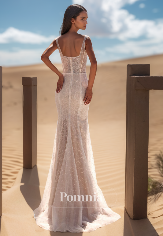 Sheath Spaghetti Straps Scoop Peals Slit Wedding Dress