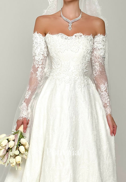 Glomorous A-Line Lace Long Sleeves Floral Appliques Lace Wedding Dress