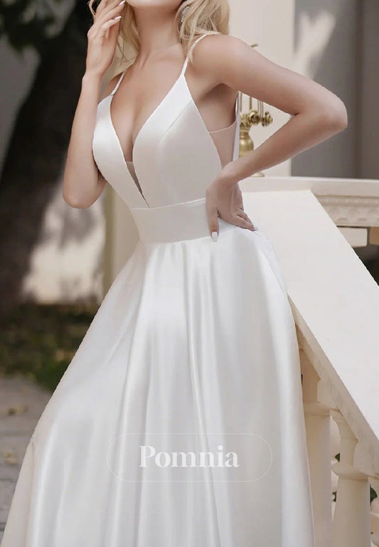 Simple Spaghetti Straps V-Neck Appliques Satin Wedding Dress