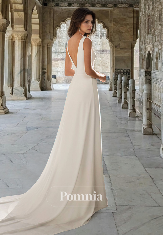 Simple Spaghetti Straps V-Neck Prom Dress with Slit Backless Sweep Train Satin Wedding Dress
