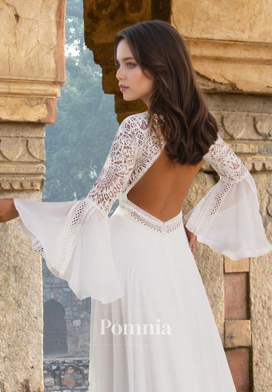 A-Line Scoop Long Sleeves Backless Empire-Waist Sweep Train Boho Wedding Dress