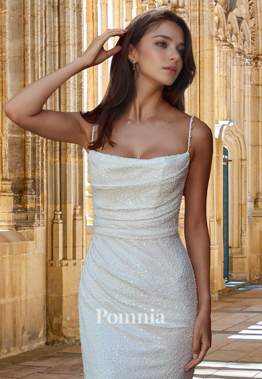 Square Spaghetti Straps Pleated Sheath Side Slit Satin Beach Wedding Dress