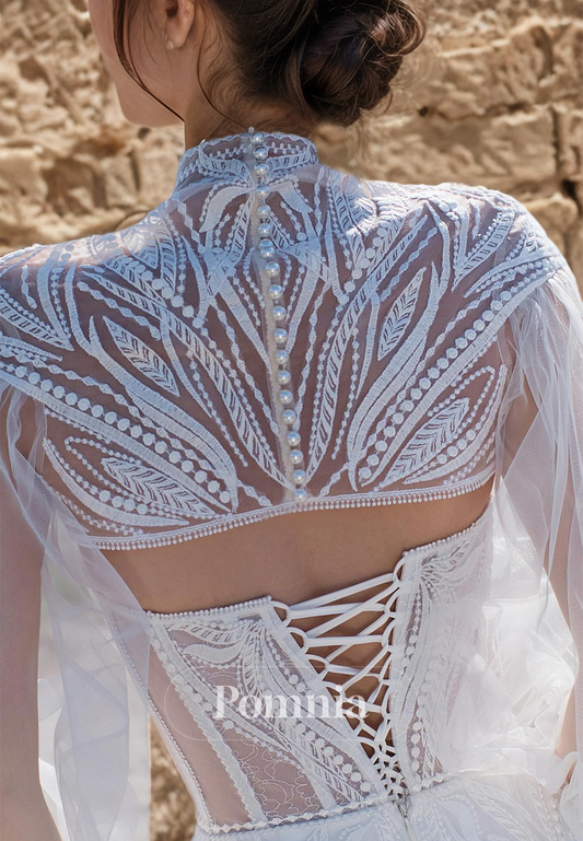 Charming A-Line Lace Long Sleeves Corset Tulle Empire-Waist Romantic Wedding Dress