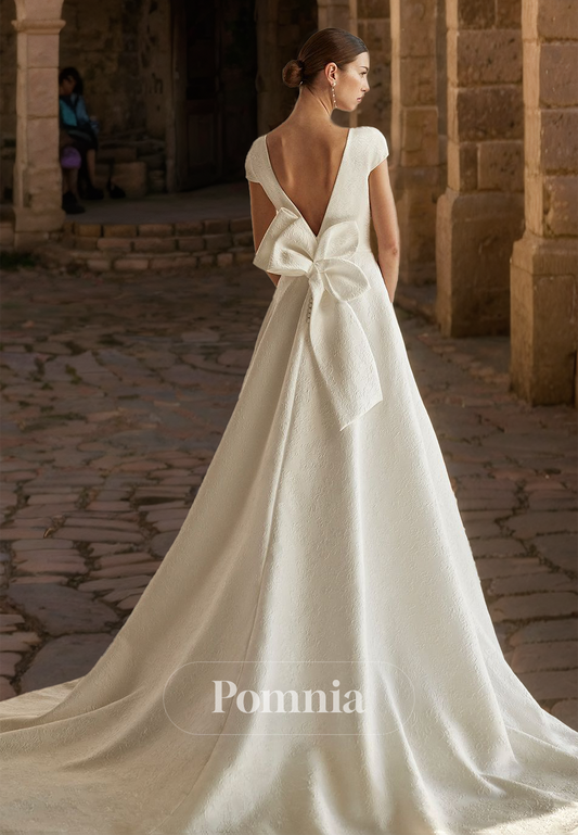 A-Line Short Sleeves Scoop Backless Bowknot Sweep Train Satin Wedding Dress