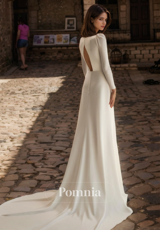 Sheath High Neck Long Sleeves Slit Sweep Train Satin Wedding Dress