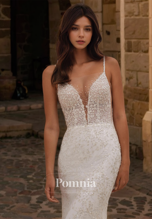 Spaghetti Straps V-Neck Empire-Waist Backless Sequins Romantic Wedding Dress