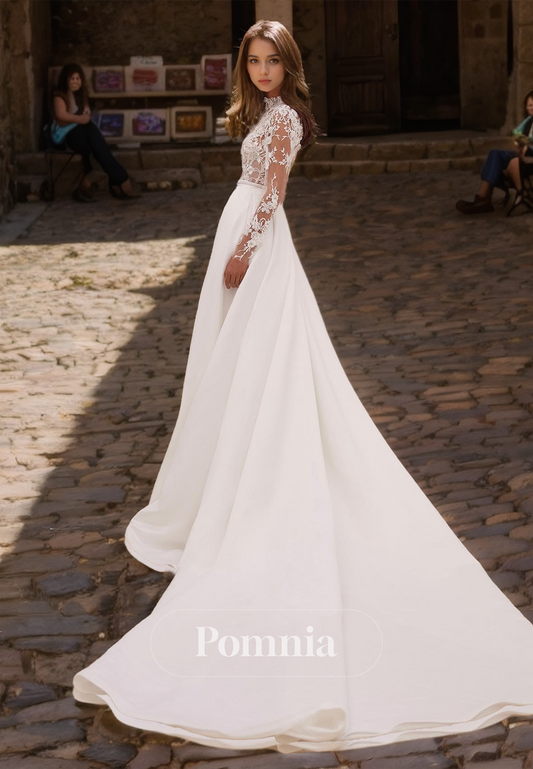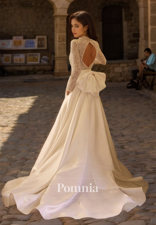 Charming Long Sleeves High Neck Empire-Waist Sweep Train Satin Wedding Dress