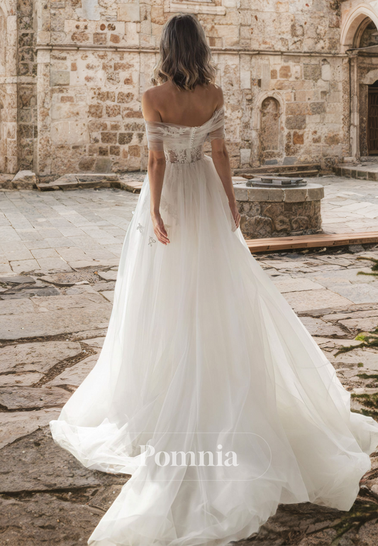 Chic A-Line Short Sleeves Off-Shoulder Corset Tulle Empire-Waist Sweep Train Lace Wedding Dress