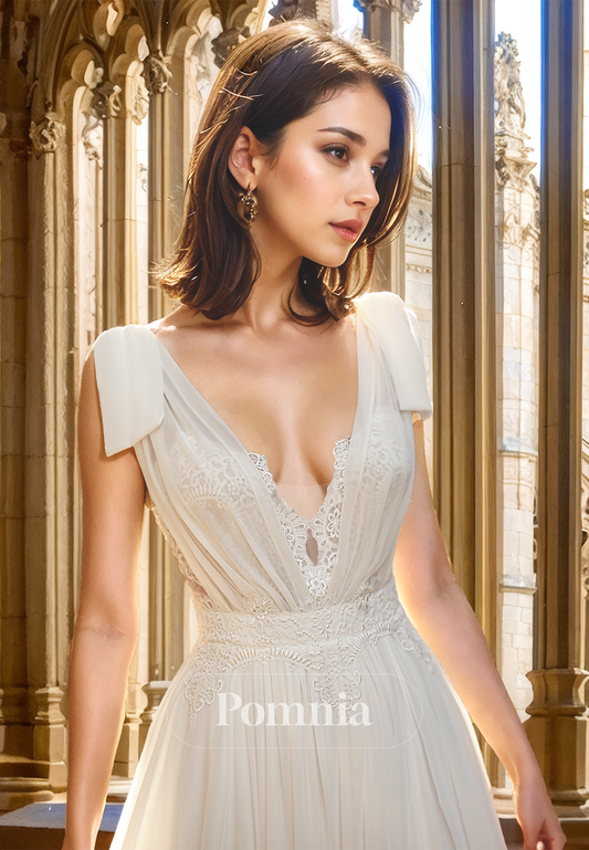 Elegant A-Line Short Sleeves V-Neck Corset Tulle Slit Sweep Train Satin Wedding Dress