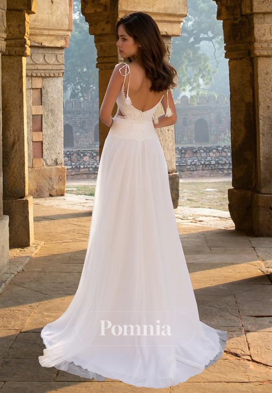 Simple Spaghetti Straps V-Neck Illusion Corset Tulle Sweep Train Beach Wedding Dress