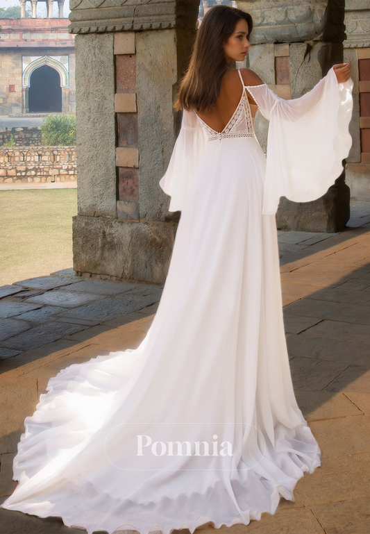 Elegant Long Sleeves V-Neck Corset Tulle Empire-Waist Backless Boho Wedding Dress