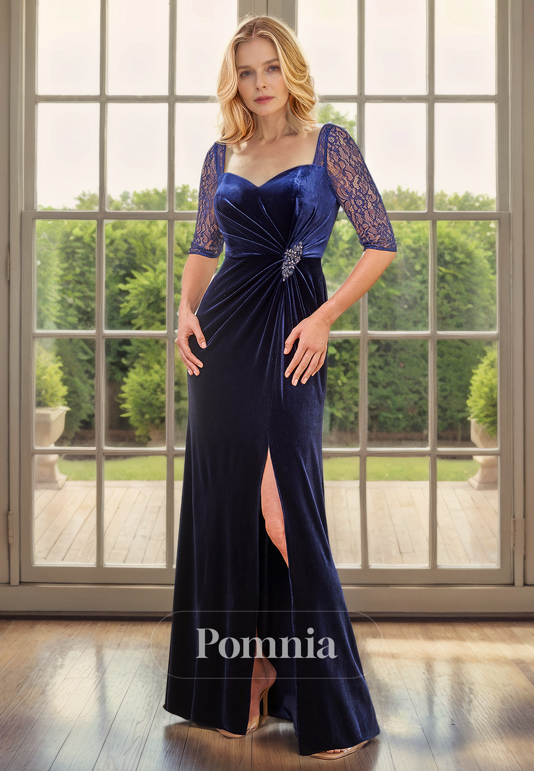This elegant mother of the bride dress features a chic sweetheart neckline and half sleeves, accentuating the empire-waist silhouette and velvet pleated skirt. Its luxurious fabric and flattering design will make you feel confident and stylish on your special day.