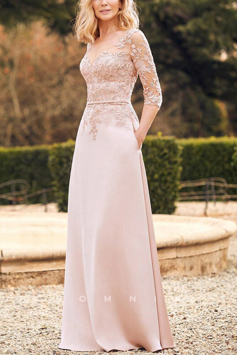 A-Line Long Sleeves Appliques Satin Long with Pockets Mother of the Bride Dress