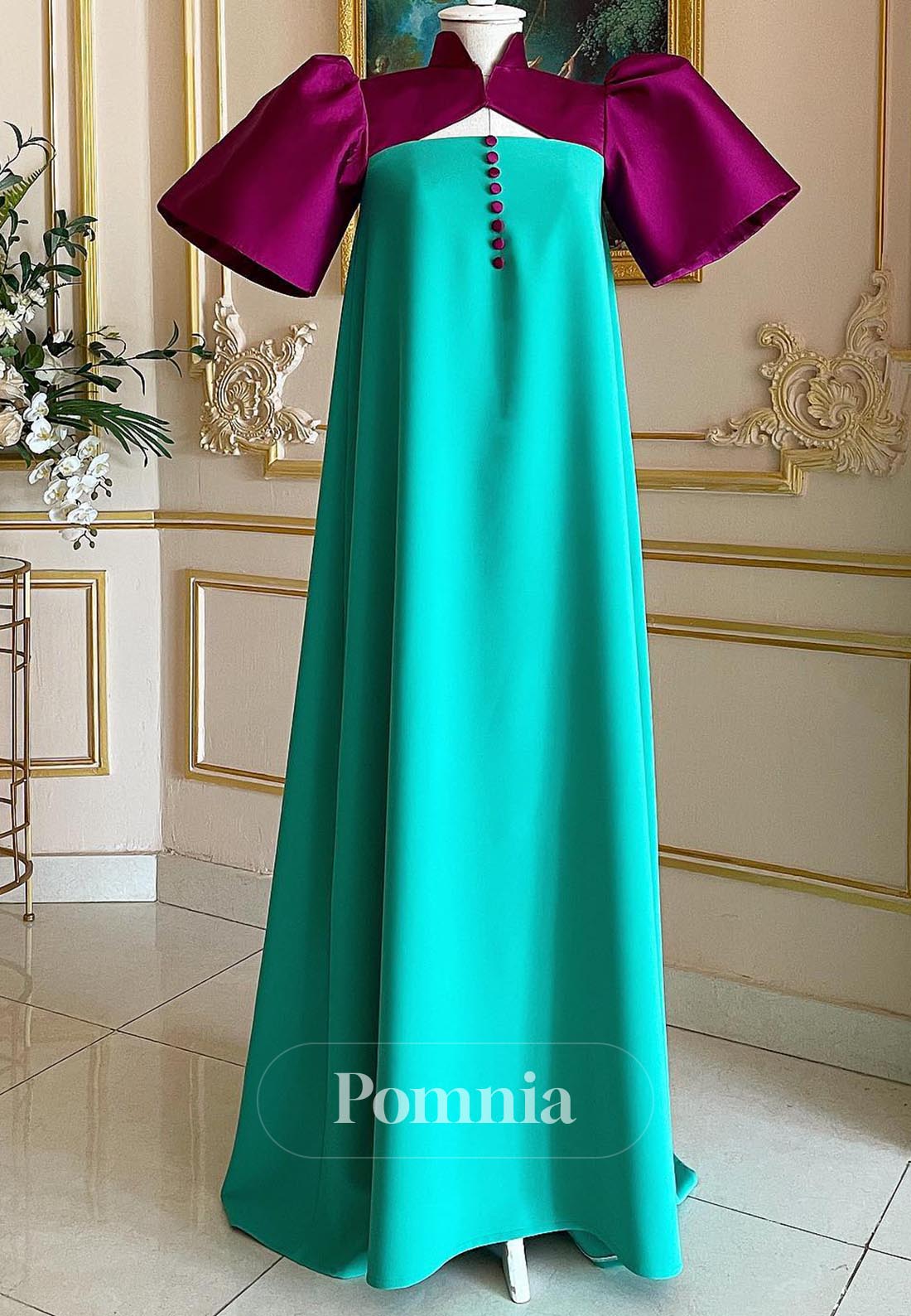 Upgrade your evening wear with the Simple Short Sleeves High Neck Empire-Waist Evening Dress. This elegant dress features short sleeves, a high neckline, and a flattering empire waist. With its simple yet sophisticated design, you'll make a statement at any event. Show off your style and confidence in this stunning dress.