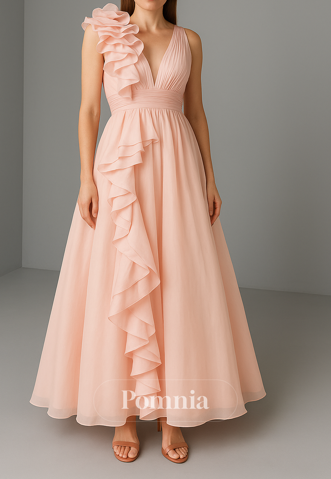 Rose Petal V-Neck Sleeveless A-Line Evening Dress