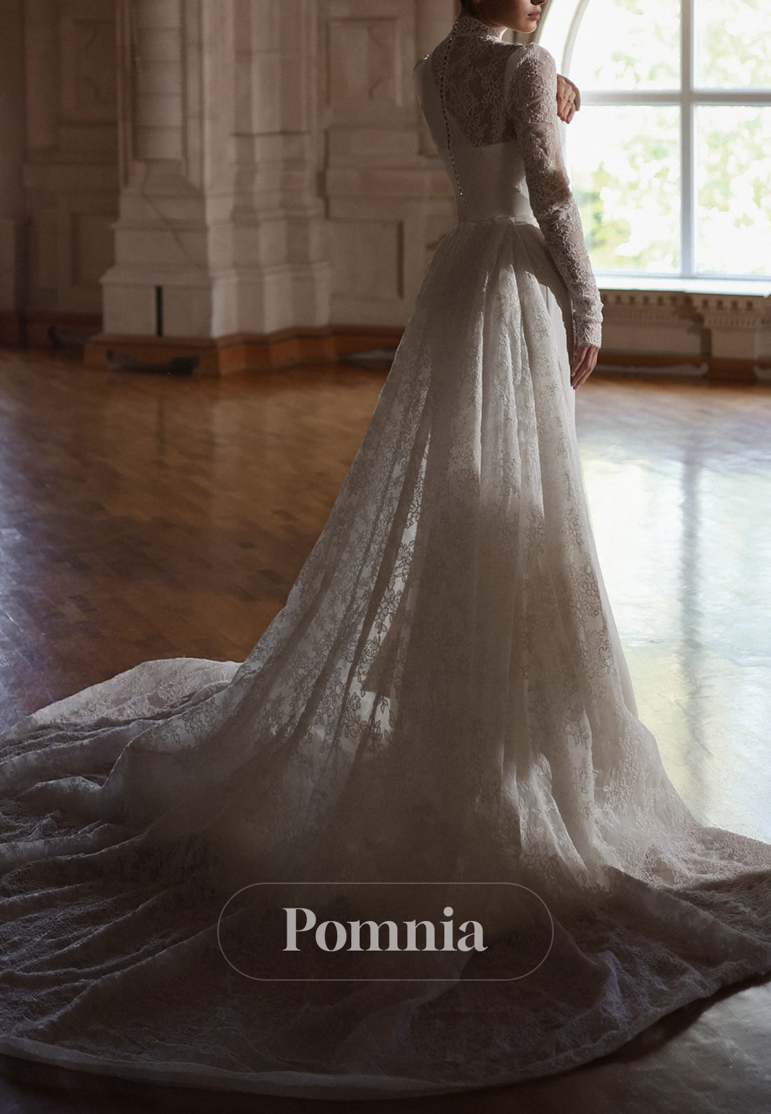 This elegant wedding gown features a high neck and long sleeves crafted from smooth satin, combining classic sophistication with modern refinement. The A-line silhouette gently flares from the waist, offering a flattering fit that enhances natural grace. Ideal for brides seeking timeless elegance and understated luxury on their special day.