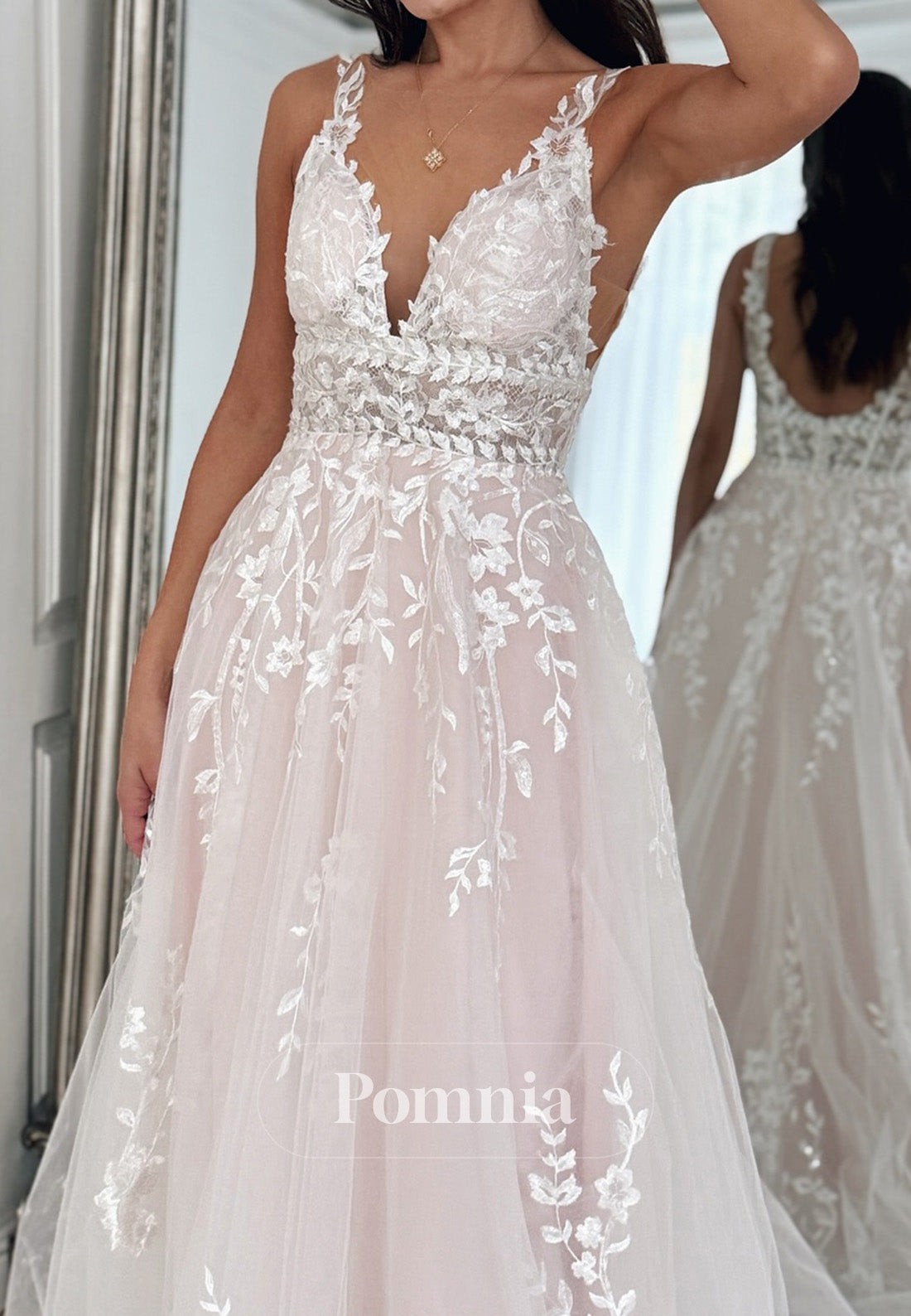 Simple Spaghetti Straps V-Neck Floral Appliques Wedding Dress