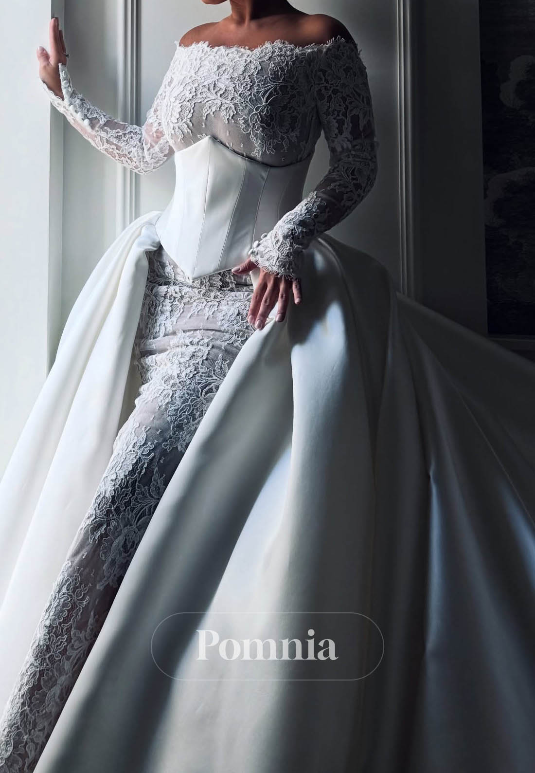 Sophisticated refinement defines this exquisite wedding dress, where tailored long sleeves meet a gracefully scooped neckline. The engineered corset bodice delivers impeccable shaping and support, creating a polished silhouette that commands attention. A sweeping train adds dramatic elegance as you move through your ceremony, creating a memorable visual impact without overwhelming the design. The long sleeves provide timeless coverage while maintaining contemporary appeal, perfect for formal celebrations and traditional ceremonies. This dress embodies understated luxury through precision construction and refined proportions—an ideal choice for the discerning bride who values architectural excellence and enduring sophistication.