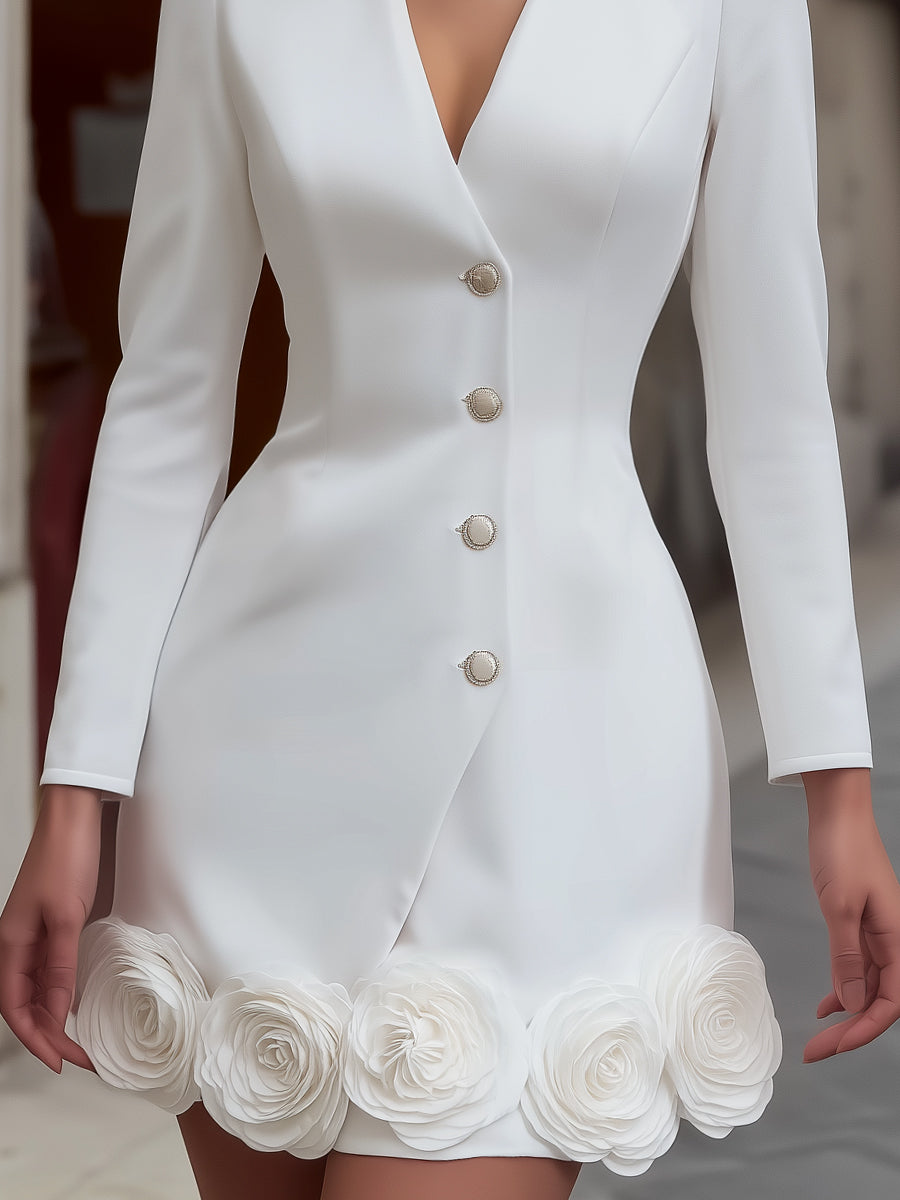 Mooyius introduces a couture-inspired blazer dress that merges architectural tailoring with soft, romantic detailing. This floral hem tailored mini dress is designed for women who appreciate precision craftsmanship and standout elegance. The structured V-neckline elongates the upper body, while the clean shoulder line and tailored long sleeves create a polished, modern silhouette.