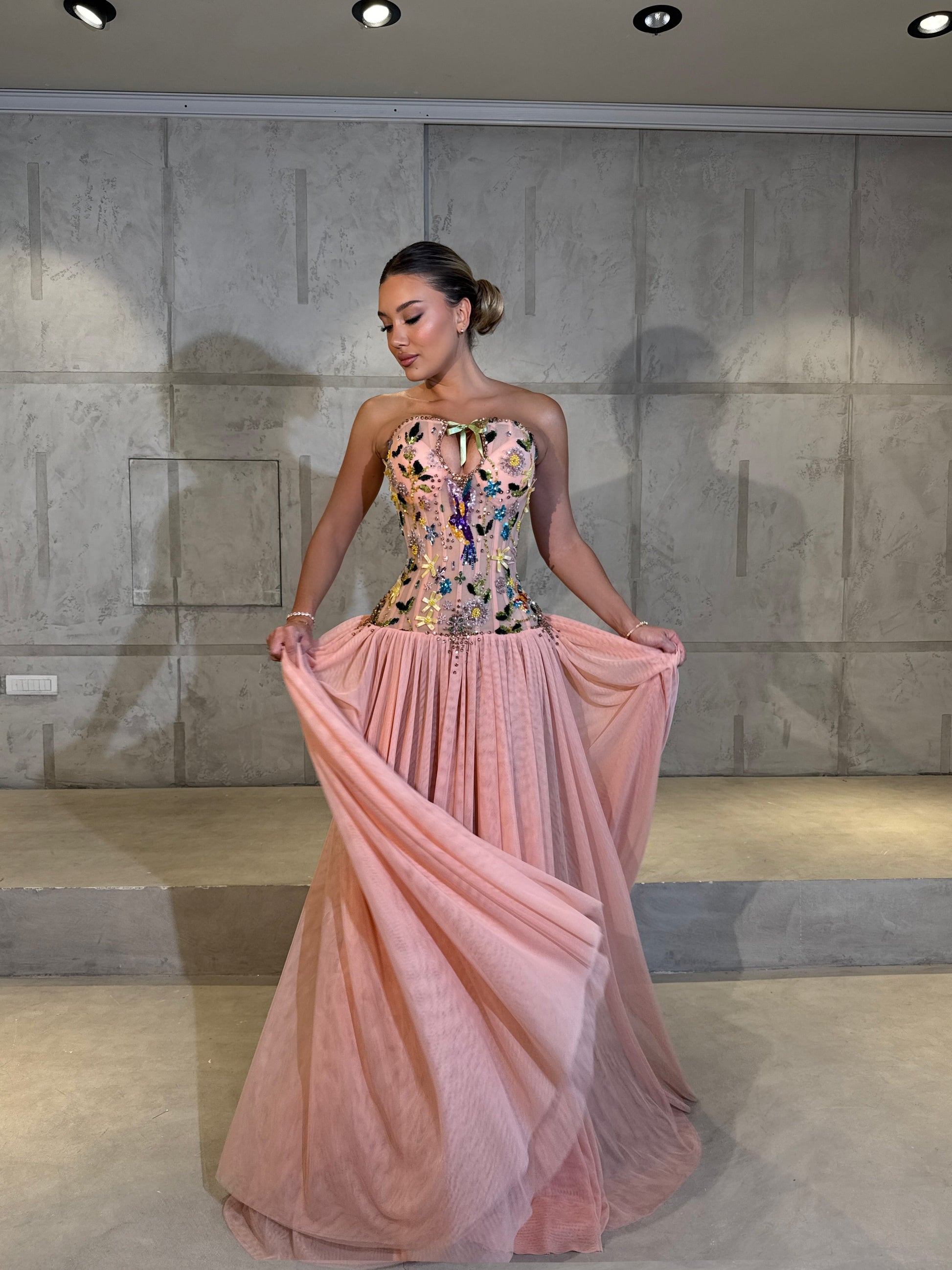 Make a stunning entrance in this exquisite pink gown, expertly crafted for the most memorable evening. Delicate 3D floral embellishments cascade across the bodice and skirt, creating dimensional artistry that catches light beautifully. The sophisticated silhouette flatters every figure while the premium fabric drapes elegantly for graceful movement. Perfect for prom, formal galas, or any occasion demanding refined elegance. This statement piece combines meticulous craftsmanship with timeless design, ensuring you feel confident and radiant throughout the night.