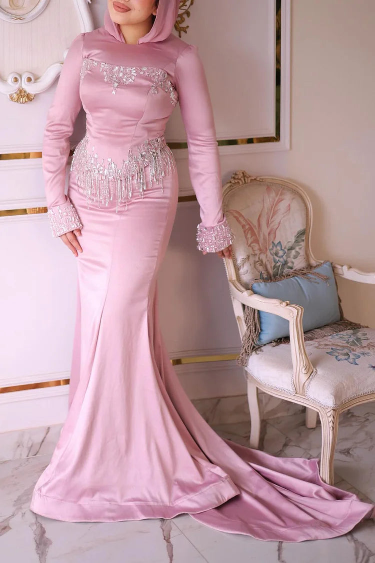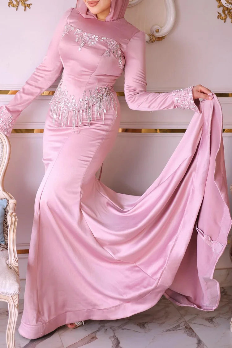 This stunning mermaid maxi dress combines dramatic elegance with eye-catching details. The fitted corset bodice provides structured support and a flattering silhouette, while intricate hot drilling and beaded embellishments create a luxurious shimmer. The signature mermaid skirt flows gracefully from the hips, and delicate fringe accents add movement and dimension. Perfect for upscale events, galas, or special occasions where you want to make a memorable impression. The sophisticated construction ensures both comfort and confidence throughout the evening.