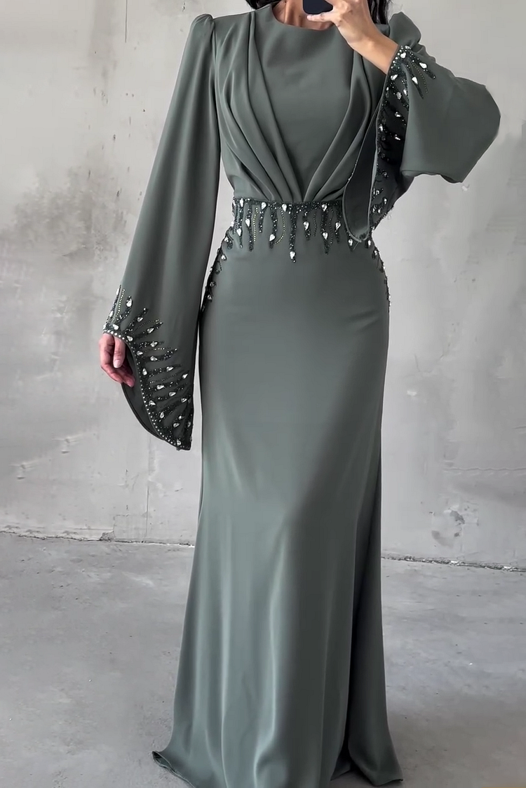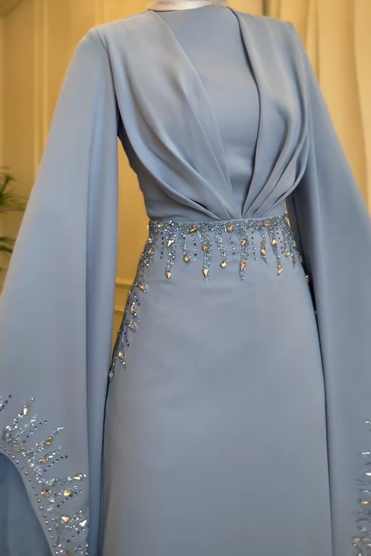 Hot Drilling Irregular Sleeve Pleated Party Maxi Dresses-Blue