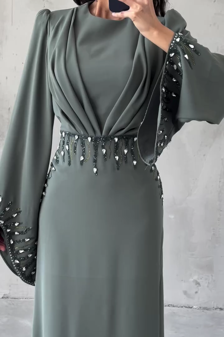 Make a statement in this striking blue maxi dress, where bold design meets sophisticated elegance. The hot drilling embellishments catch light beautifully, while the irregular sleeves add an avant-garde edge to your silhouette. Cascading pleats create fluid movement and flattering dimension throughout the skirt. Perfect for upscale events, galas, or memorable celebrations, this dress combines intricate detailing with contemporary style. The maxi length ensures timeless appeal, while the unique sleeve construction sets you apart from conventional party wear. Ideal for those who appreciate fashion-forward pieces that command attention.