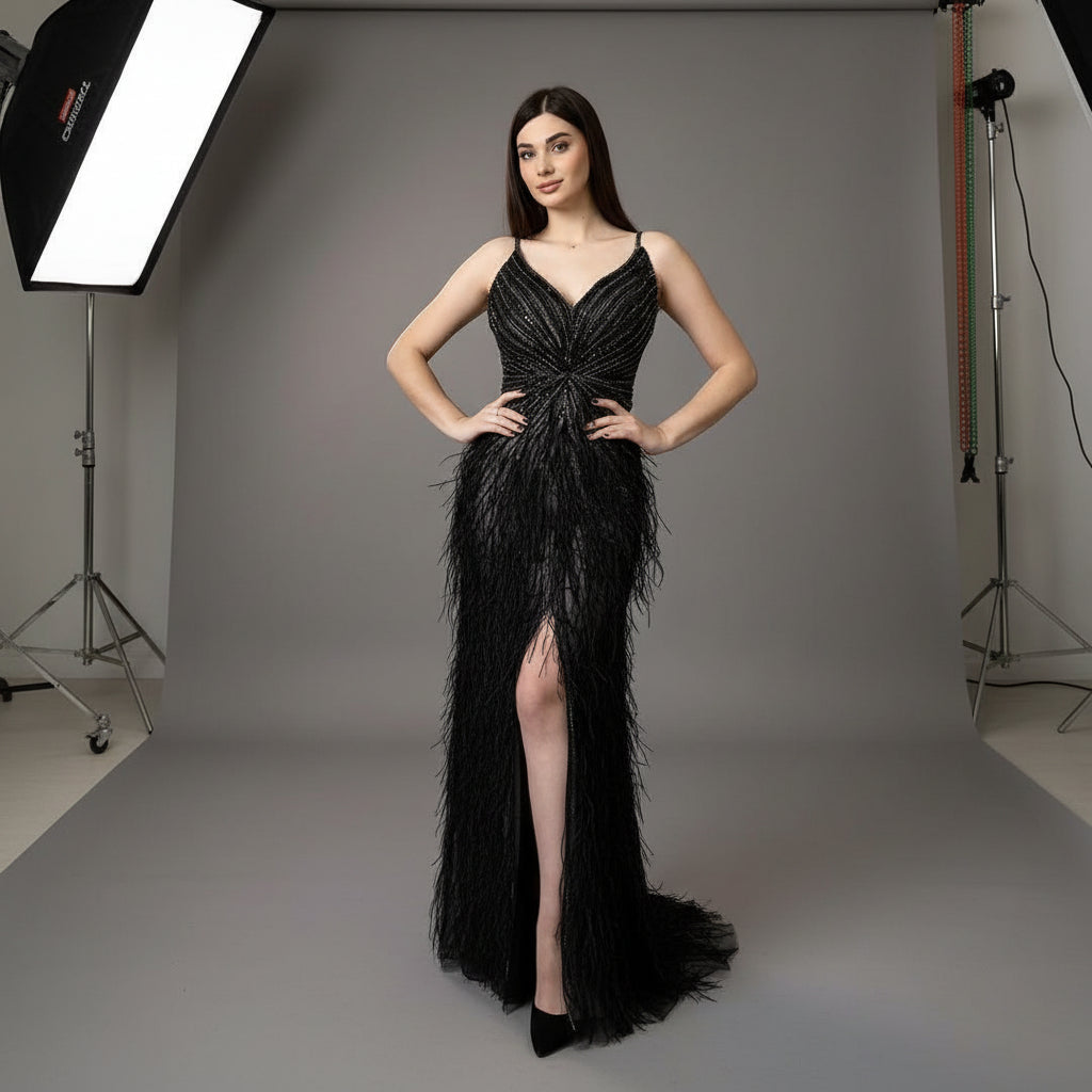 An exquisite evening statement, this mermaid gown showcases sapphire-hued feathering paired with meticulous beadwork that creates luminous dimension on the silhouette. The flowing split provides contemporary ease without compromising the dress's inherent elegance. Perfect for prom and black-tie events, this piece combines haute couture craftsmanship with modern sensibility—designed for those who understand that true luxury lies in impeccable detail and refined restraint.