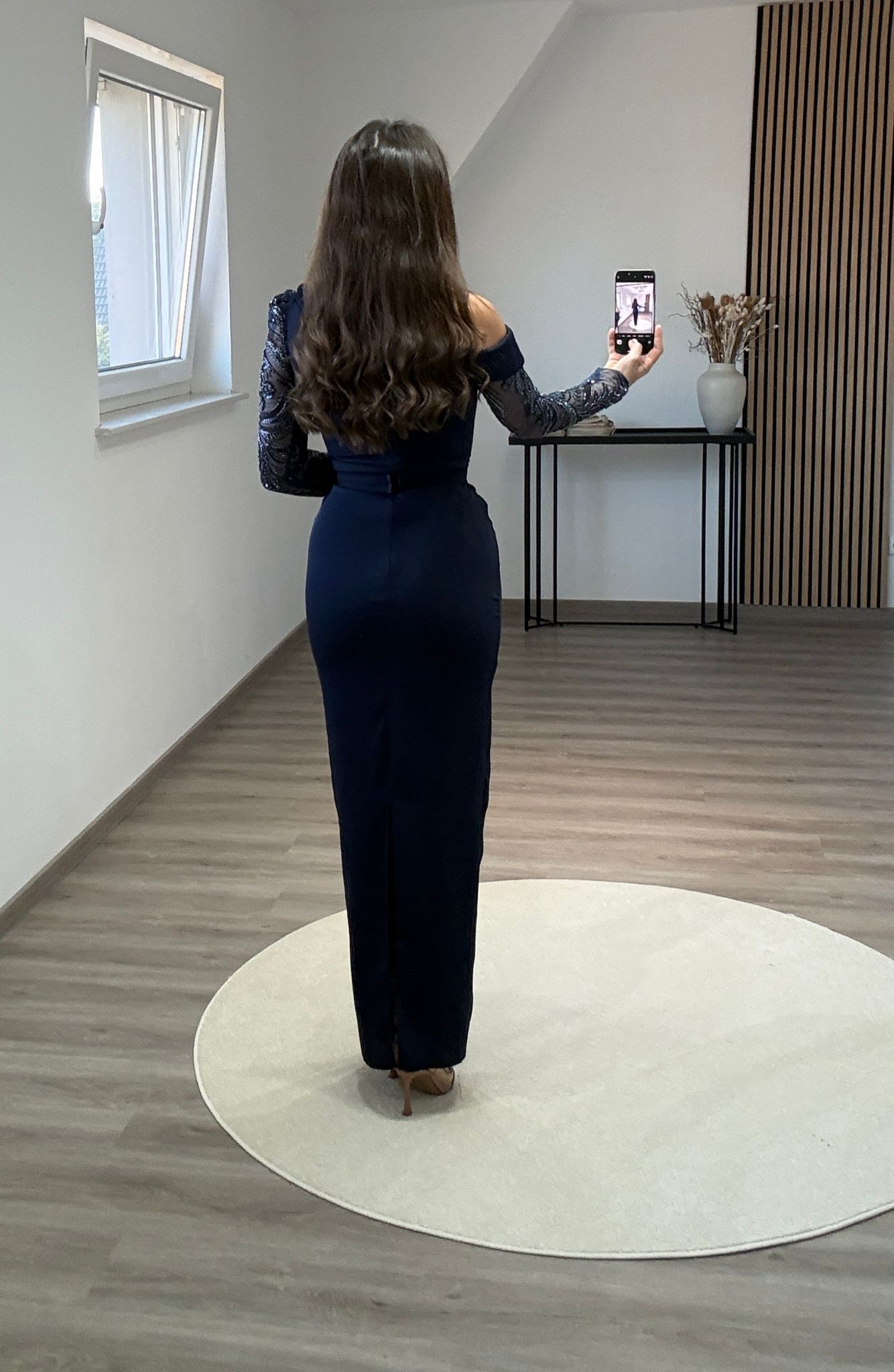Crafted from luxurious satin, this evening dress combines timeless sophistication with contemporary design. The flattering V-neckline and strategically placed ruching create an elegant silhouette that gracefully contours the body. Long sleeves provide refined coverage while maintaining a polished aesthetic perfect for formal occasions. The fluid satin fabric drapes beautifully, ensuring comfort and movement throughout the evening. An ideal choice for galas, weddings, and upscale events where understated elegance makes the strongest impression.